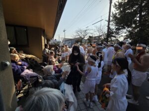 今年は晴天に恵まれ、入居者大勢の入居者が玄関先に出て、地域の方と一緒に行事を楽しみました!!